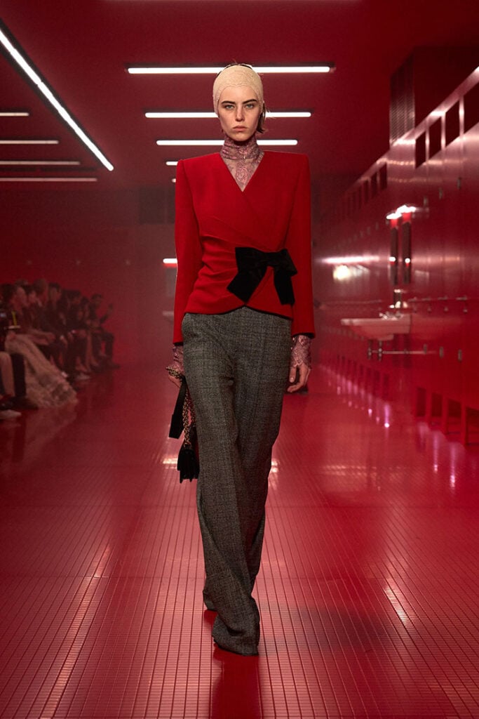 The red wrap jacket, cinched with a black velvet bow, paired with houndstooth trousers, was the kind of refined yet playful tailoring that felt reminiscent of late-’70s to early-’80s power dressing — strong shoulders, sharp lines, but still utterly feminine in spirit.