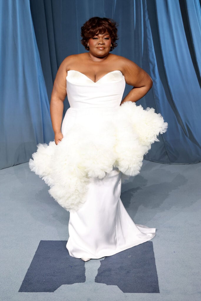 Maggie Gyllenhaal, meanwhile, leaned into Celine’s refined minimalism wearing a sculptural black gown defined by voluminous balloon sleeves. It’s the kind of understated drama that perfectly suits her pared-back sensibility — elegant but never trying too hard. The addition of an onyx ring and the Celine Lise Perforated Triomphe Richelieu flat lace-up shoes completed the look. Groundbreaking? No. Pure Maggie? Yes.