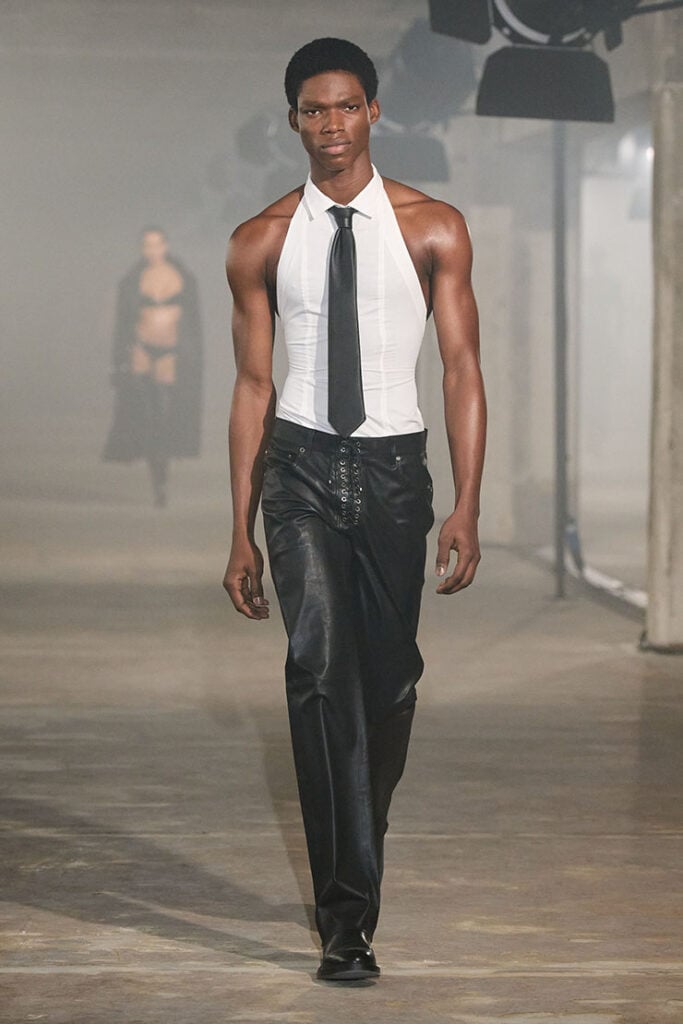 I know some of you think the actor is in his “midlife crisis” era, but honestly, this is deeper than shock value. His Ludovic de Saint Sernin Fall 2025 look — a halter-style white shirt with a black leather tie and lace-up leather trousers — is a direct nod to the psychological power dynamics at the heart of his film.
