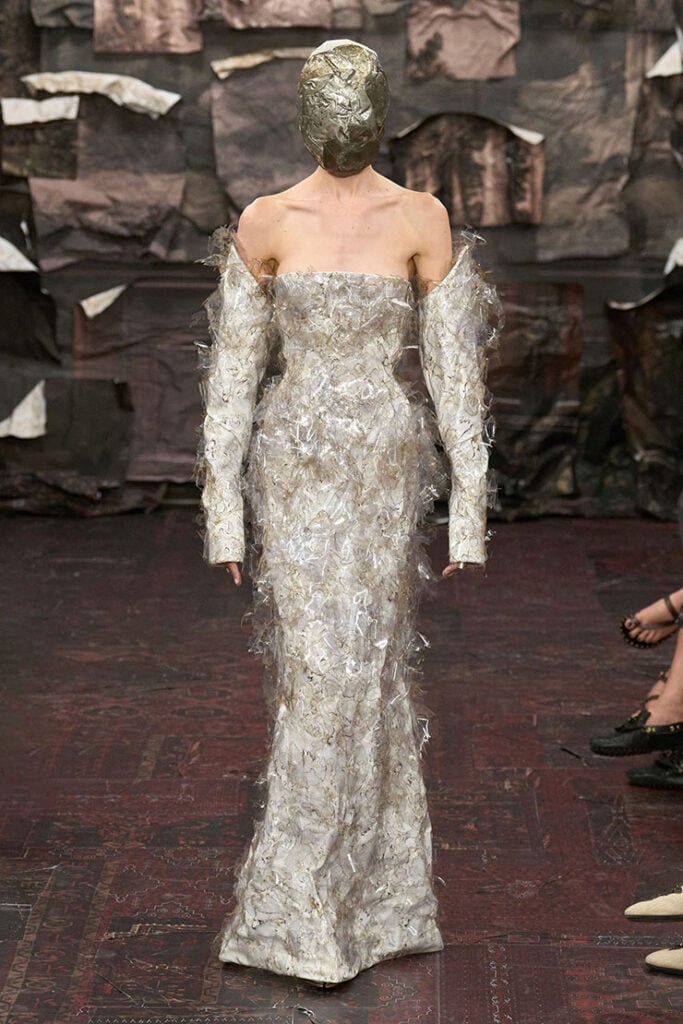 She wore a Maison Margiela Fall 2025 Artisanal gown by Glenn Martens — a look born from the collection’s theme of “decaying elegance.” The gown blends repurposed materials, including what appears to be a form of burnished plastic sheeting. On the runway, the look leans into the conceptual darkness that Margiela is known for, but on Michelle, it read differently: refined texture and couture-level technique disguised beneath a raw finish.
