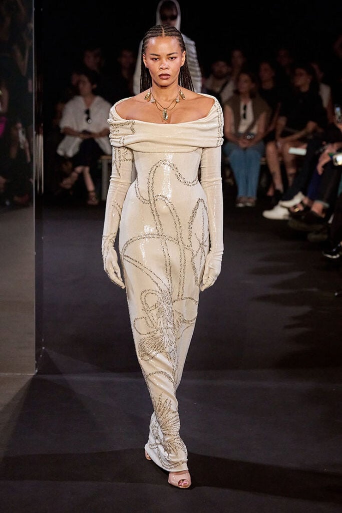 I know what you’re thinking: this Wiederhoeft Spring 2025 off-the-shoulder draped neckline corseted gown isn’t giving “Disney premiere” or “family-friendly animated film.” And honestly? That’s exactly why I adore it. Ginnifer has such a recognisable aesthetic — soft, sweet, slightly nostalgic — that seeing her in something bolder, sharper, and more editorial immediately grabbed my attention. The matching gloves, the sculpted neckline, the glimmer across the embroidery… it all leans into high-fashion theatricality in a way she rarely explores.
