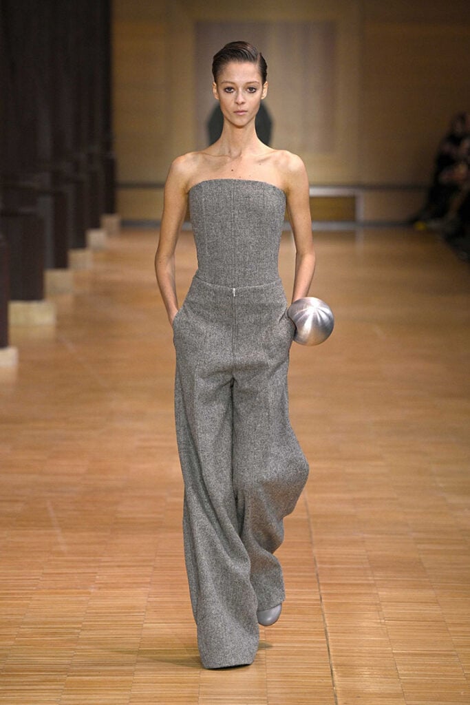 But mood changed later in the evening, when she arrived in a tweed Véronique Leroy Fall 2025 look that felt like a masterclass in French modernity. The fabric had that timeless, slightly rustic texture, but the execution was thoroughly contemporary — corset, wide leg trousers and a cropped bomber jacket with droplet-shaped shoulders.