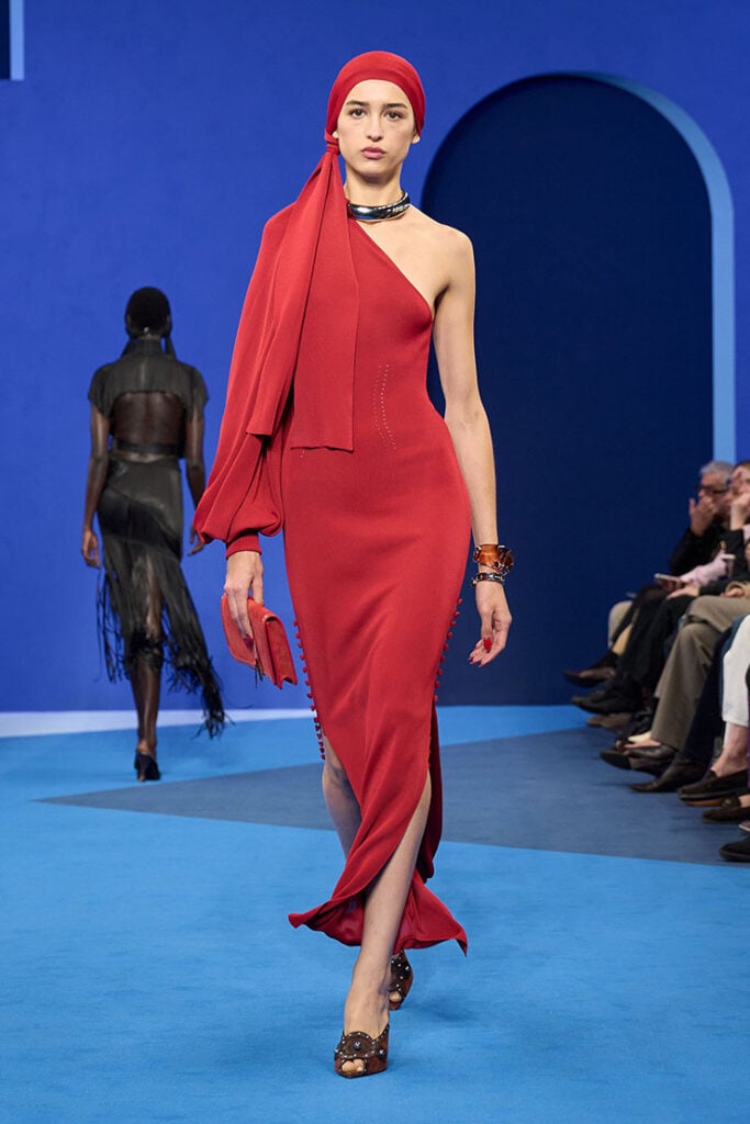 The actress wore a Lanvin Spring 2026 dark red asymmetrical choker knit dress by Peter Copping that feels refreshingly free from a theme. I couldn’t help but think of early ’90s Donna Karan when I saw that choker neckline — those smooth, close-cut silhouettes that did sexiness without excess.