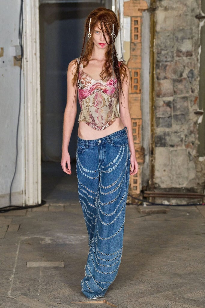 Pairing the corset with Dilara Fındıkoğlu’s Rushing Hour buckled jeans is where the look fully locks into the film’s emotional message. If the corset represents Catherine’s social constraint, the jeans lean toward defiance, pulling the look out of nostalgia and into conflict. This push pull effect has remained consistent throughout the press tour.