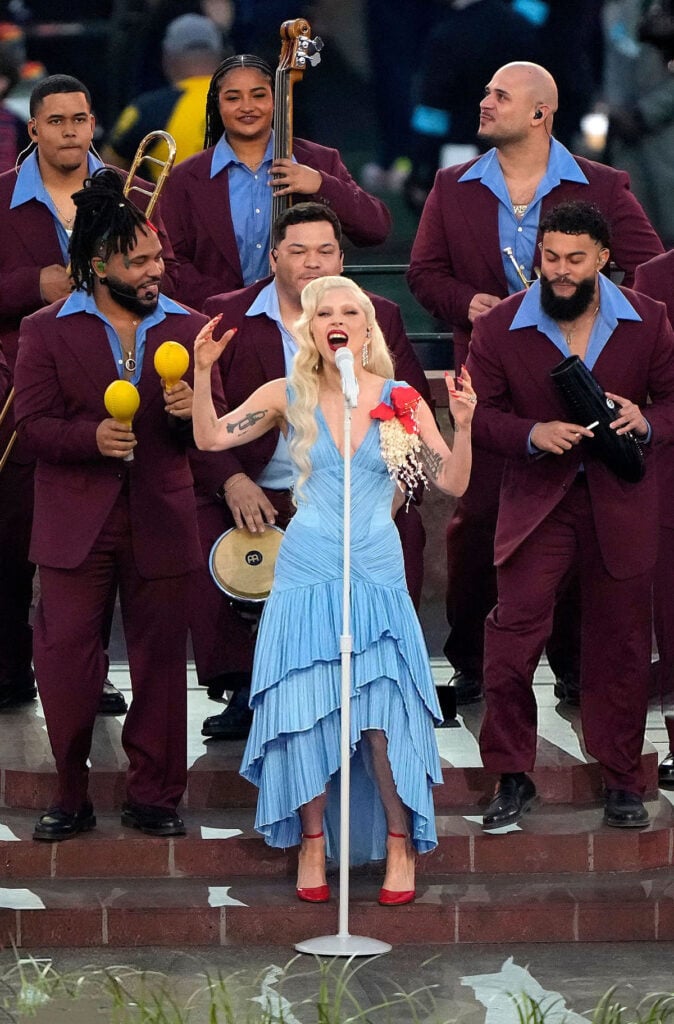 A diamond necklace sat cleanly against the strapless neckline, while matching earrings and rings echoed that restraint.