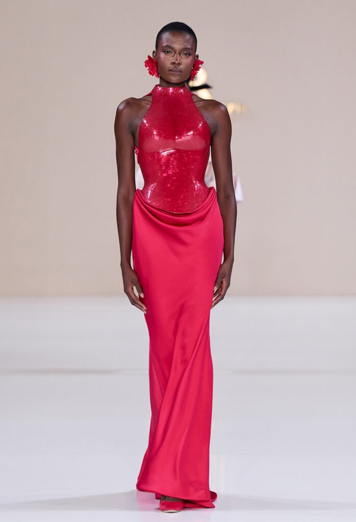 The sculpted, high-shine breastplate creates a sculptural, almost armour-like finish, while the draped satin skirt falls into a fluid, floor-sweeping silhouette. I love how the contrast between structure and softness captures the duality of her style in a single look.