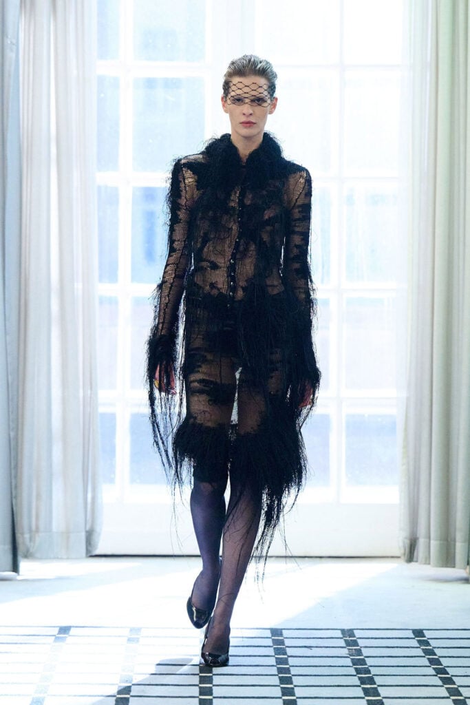 I truly love this Lou de Bètoly Fall 2026 knit dress, partly because designs like this always make me instantly nostalgic for Mark Fast, but also because this eerily gothic piece feels perfectly aligned with the British singer’s aesthetic. The shredded knit texture and trailing threads give it that undone edge she wears so well. Opening up the neckline completely changes the mood of the look.