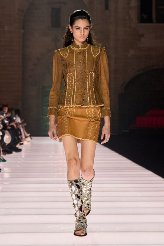 The British actress was, of course, in Louis Vuitton, wearing a green leather jacket with a matching skirt from the Resort 2026 collection.