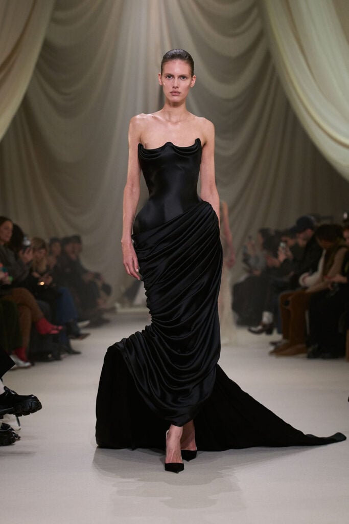 This is pure craftsmanship, from the moulded, anatomical bodice to the way the draped, structured silk skirt cascades into a dramatic pooling train. The sculpted neckline gives the gown its edge, while the precision of the draping adds to the allure. Every angle works. Every fold feels considered.