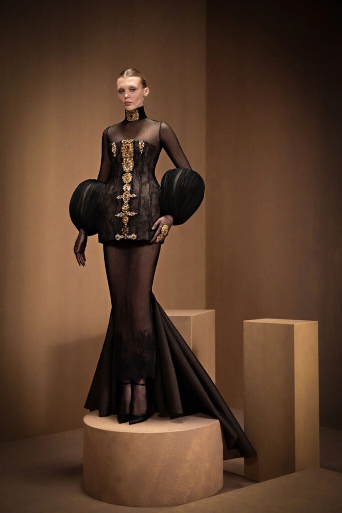 The look instantly commands attention. The sheer black base, sculpted lace corset and ornate gold embroidery create a striking vertical line through the centre of the look, giving it a regal, almost ceremonial feel. Then those voluminous sleeves add drama and presence, before the silhouette softens into a sheer flared skirt. It is the kind of couture moment that feels perfectly at home in a museum setting.