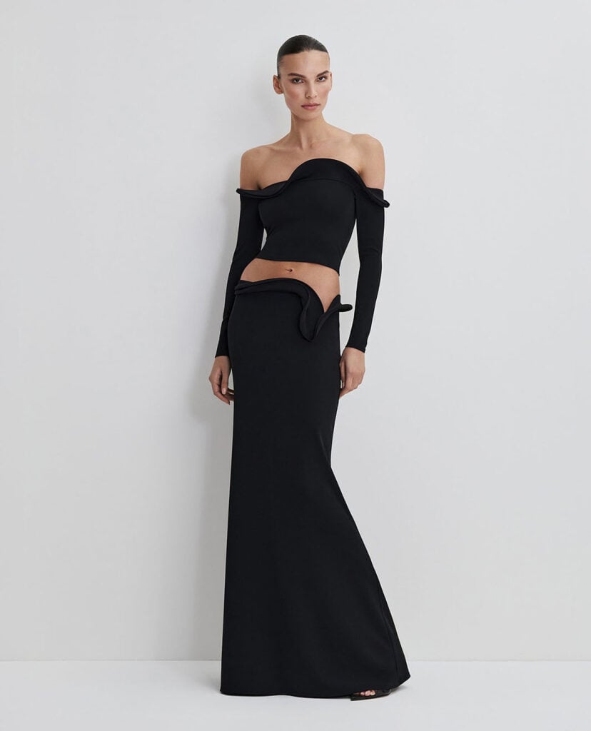 The black column skirt continues that clean, elongated line, while the cut-out waist adds a modern, slightly unexpected twist.