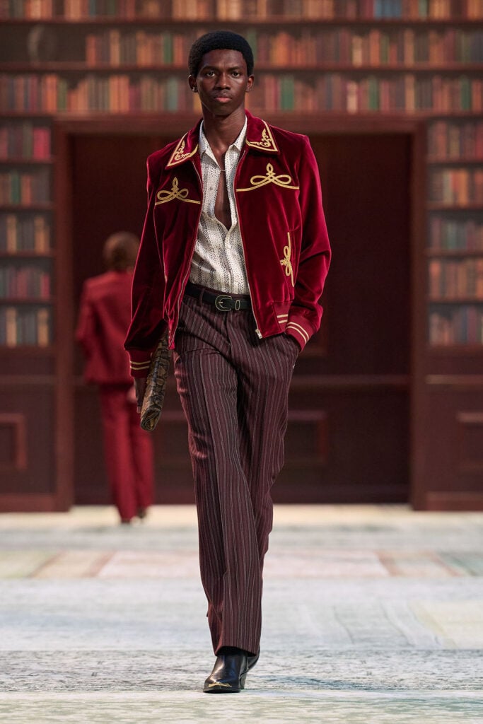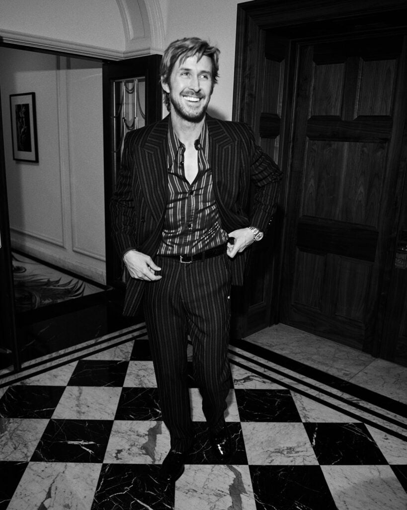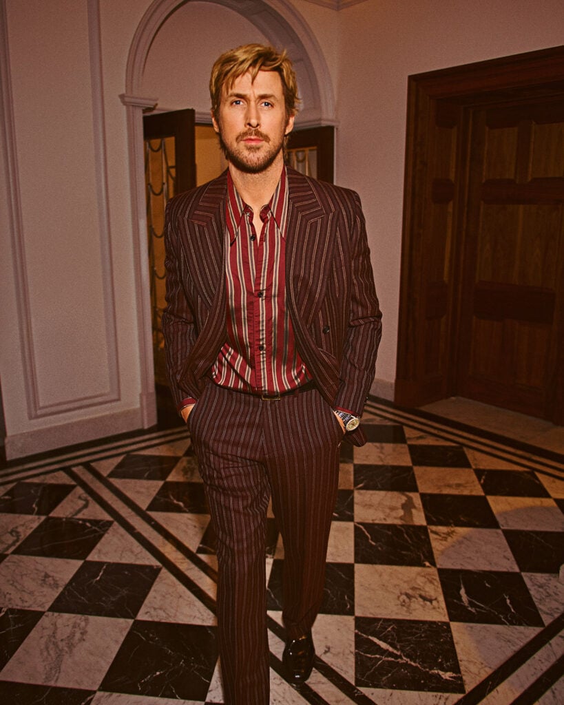 Here that came in the form of a burgundy pinstriped suit paired with a contrasting striped shirt worn slightly open at the collar. The result feels relaxed but considered, striking the balance between polish and personality that Ryan tends to favour.