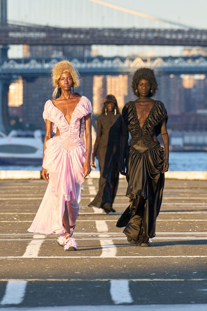 Cocktail dresses are not usually the lane we associate with Bode, which is why Lux Pascal’s look immediately stands out. The brand is far more synonymous with artisanal tailoring and narrative-driven pieces, so seeing it translate that sensibility into eveningwear, that is a historical reproduction of a 1930s style, makes this moment particularly interesting. The sequinned bodice gives the look its evening sparkle, while the sheer skirt lightens the silhouette, and those red and purple accents inject just enough colour to keep the dress visually alive.