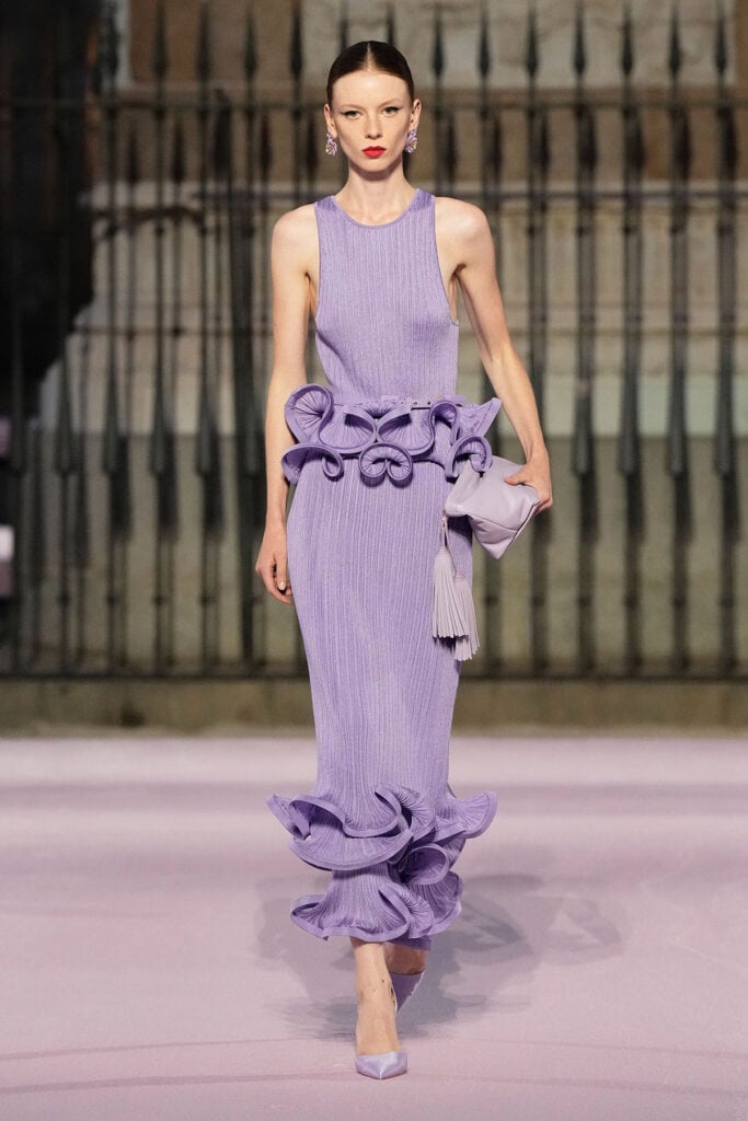 Chase Infiniti wore a Carolina Herrera Spring 2026 lilac knit dress defined by sculptural ruffles circling the waist and hem. While many leaned into sultry territory on this red carpet, Chase stayed true to her usual elegant aesthetic.