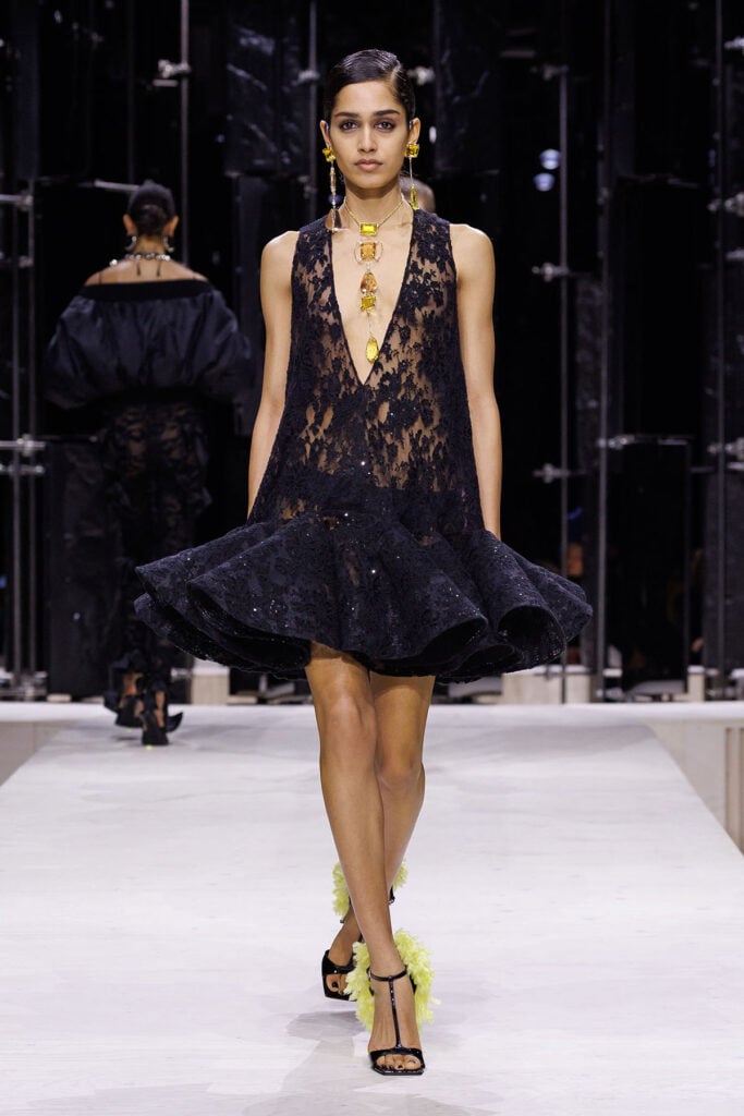 Kaia Gerber was, of course, the first to step out in a look from the Givenchy Fall 2026 collection, which Sarah Burton presented less than a week ago. And considering Kaia’s love of Givenchy black lace dresses, I am not surprised that the model had this mini dress FedExed out of Paris as soon as it stepped off the runway. The plunging neckline and sculpted skirt balanced delicacy with structure, creating a silhouette that felt more playful than we are used to seeing from the model, but it worked perfectly for this event.