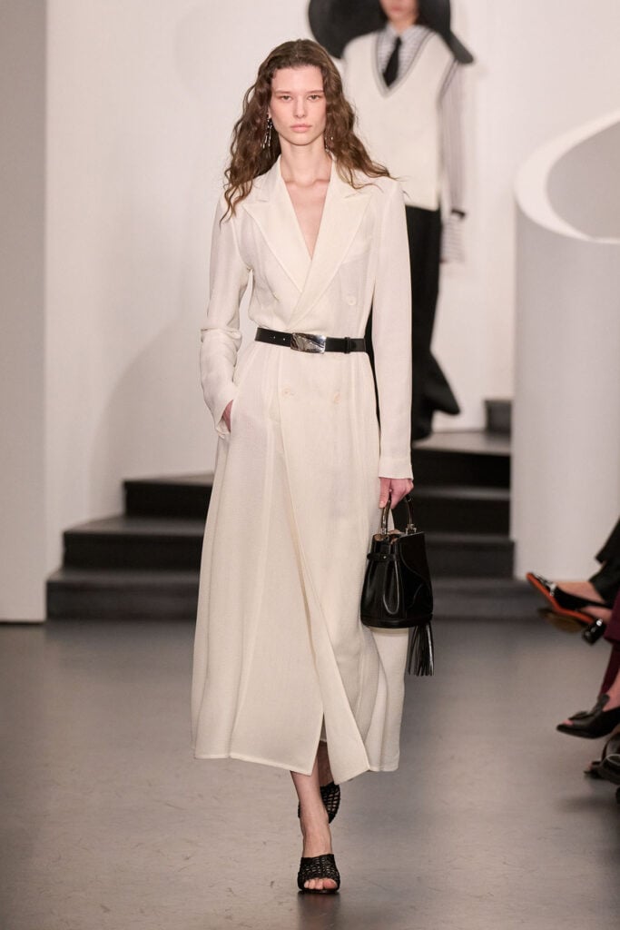 Unfortunately, Dakota Fanning isn’t selling this Ralph Lauren Spring 2026 shirt dress to me, and that has a lot to do with the styling. The Dior belt feels a bit random considering the clean lines of the dress, while the black boots feel too heavy for such a light, classic silhouette.