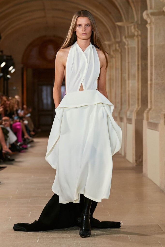 Hilary’s pale-blue version reads as one idea from the front, while the black back panel introduces a completely different direction, which breaks the flow of the look. The contrast works better on the runway because the boots reinforce that shift, tying the elements together, whereas here the idea feels less fully realised.