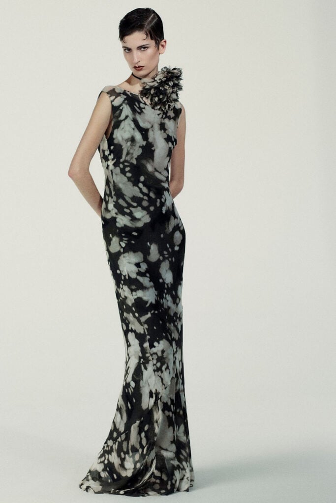While some may still long for her more experimental choices, there’s a noticeable shift here towards a softer, more refined direction that feels in step with the setting. This chiffon printed dress, rendered in a diffused, almost ink-blot pattern, brings a different kind of presence.