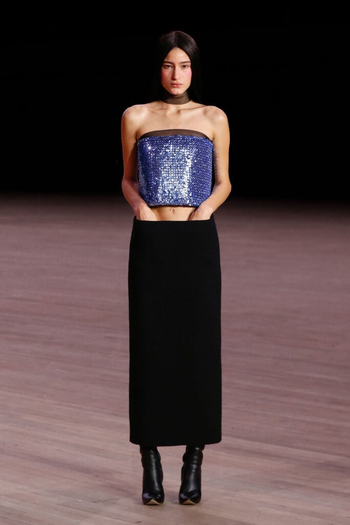 There is a clear Blue Book nod here, and the floating skirt brings an element of intrigue, but the sequinned top is where things unravel slightly. The way it sits across the bust creates the impression that it has slipped, exposing what reads as an underlayer rather than an intentional part of the design.