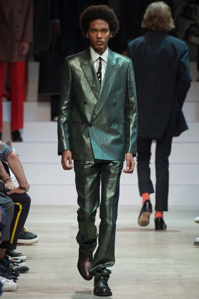 David Jonsson wore a Loewe Spring 2026 look featuring a classic T-shirt and wide-leg trousers with stripe detailing, finished with Bobine ankle boots. The proportions do the heavy lifting here – the volume, the length, the ease – and it all comes together with his usual strong sense of identity.