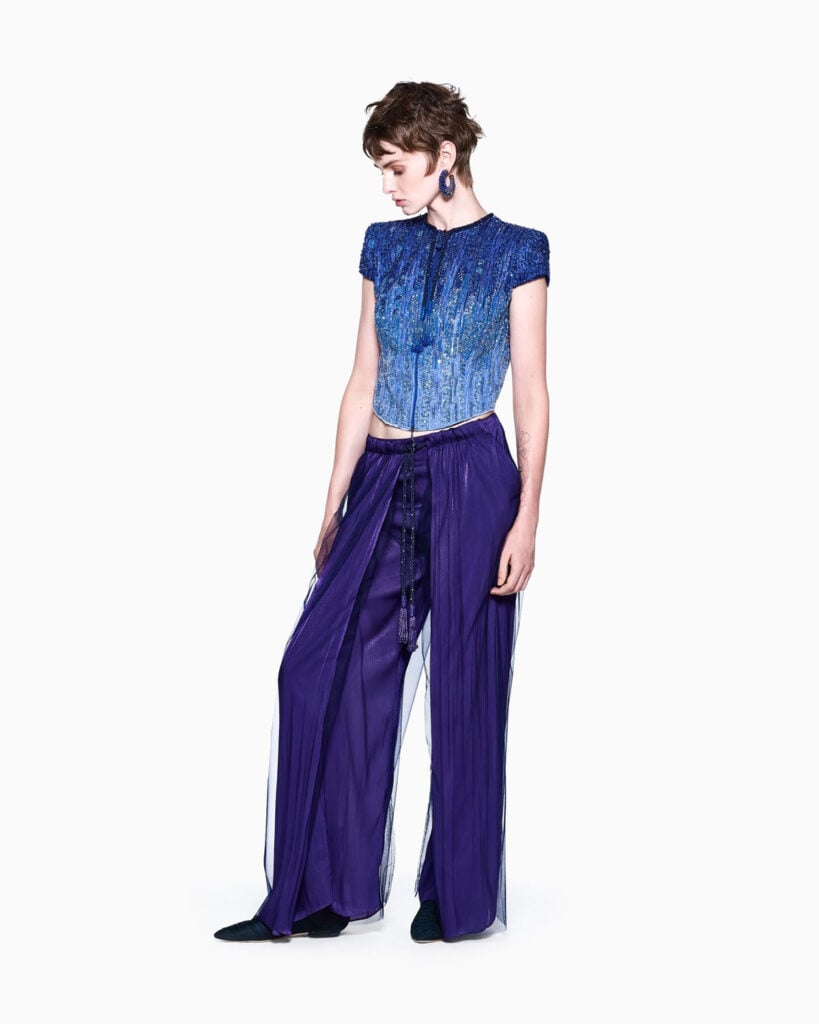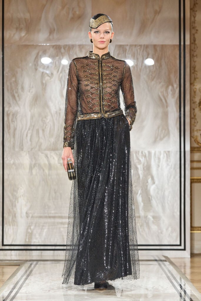 Considering everything we know about the distinction between Haute Couture and ready-to-wear, at first glance it would be easy to assume that the blue short-sleeve jacket, intricately embroidered with beads and sequins to create a refined all-over dégradé effect, belongs to the couture side of the house. In fact, it comes from Giorgio Armani, while the black sequinned skirt hails from the Armani Privé Fall 2025 collection.