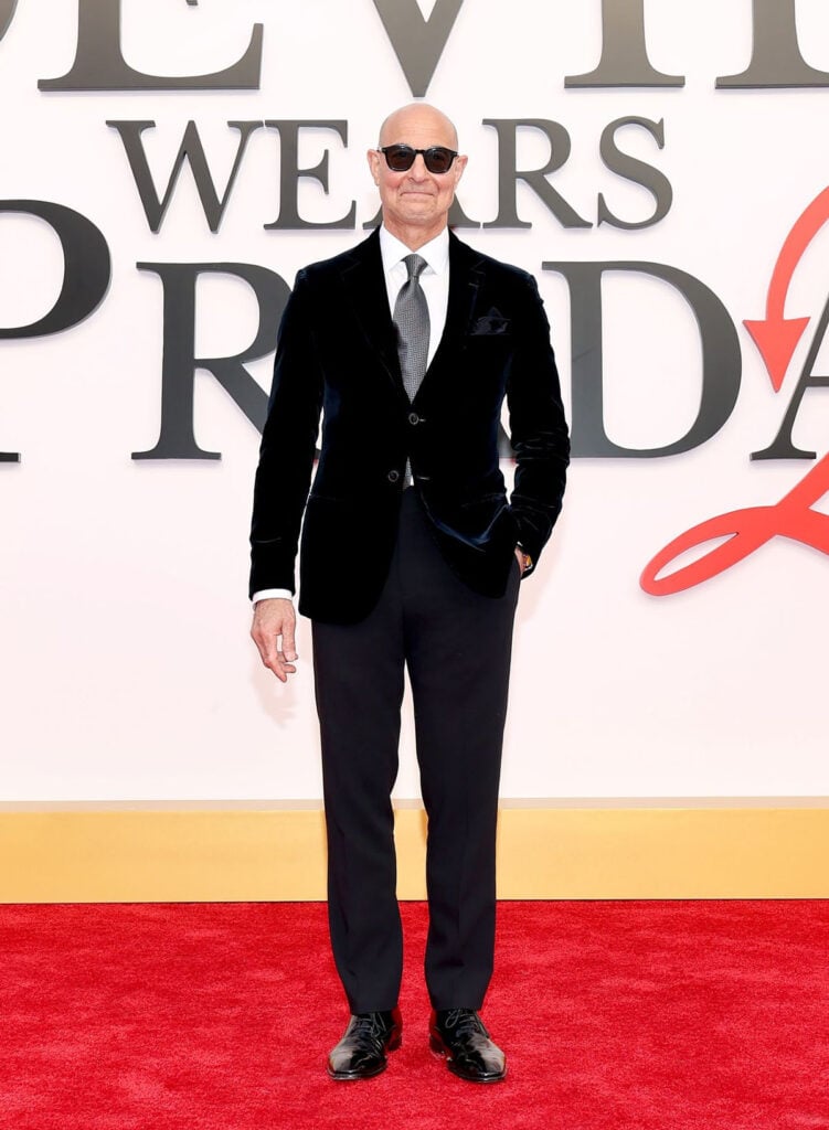 Stanley Tucci, being in London, naturally wore one of our most revered menswear labels in Paul Smith, delivering exactly what you would expect from him: a sharply cut pinstripe suit that just oozes authority. The look was elevated with his signature finishing touches – sleek sunglasses, a neatly folded pocket square, and polished shoes that reinforced his effortless precision.