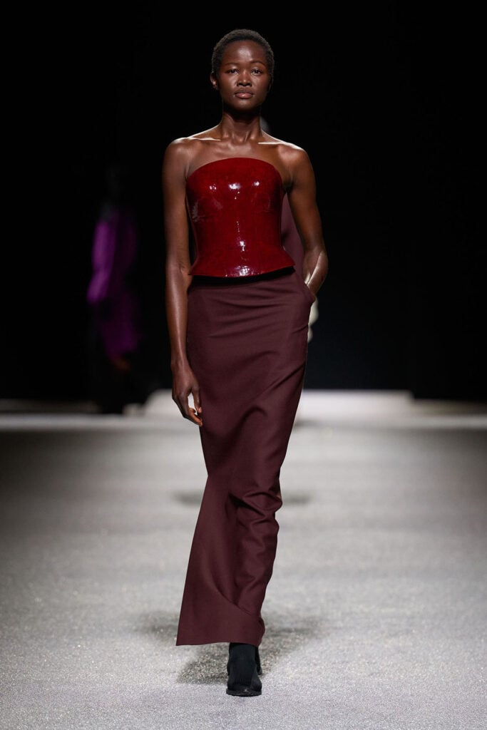 While the skirt feels a touch too long, the focus here is firmly on the lacquered bodice. Issey Miyake is often associated with innovation in fabric and form – think pleating techniques and sculptural construction – and this glossy, curved piece feels inspired by the house’s moulded acrylic ‘Plastic Body’ breastplate from Autumn-Winter 1980-81. The high-shine finish and contoured shape feel like a modern continuation of that idea, giving the look a strong focal point against the fluidity of the skirt.