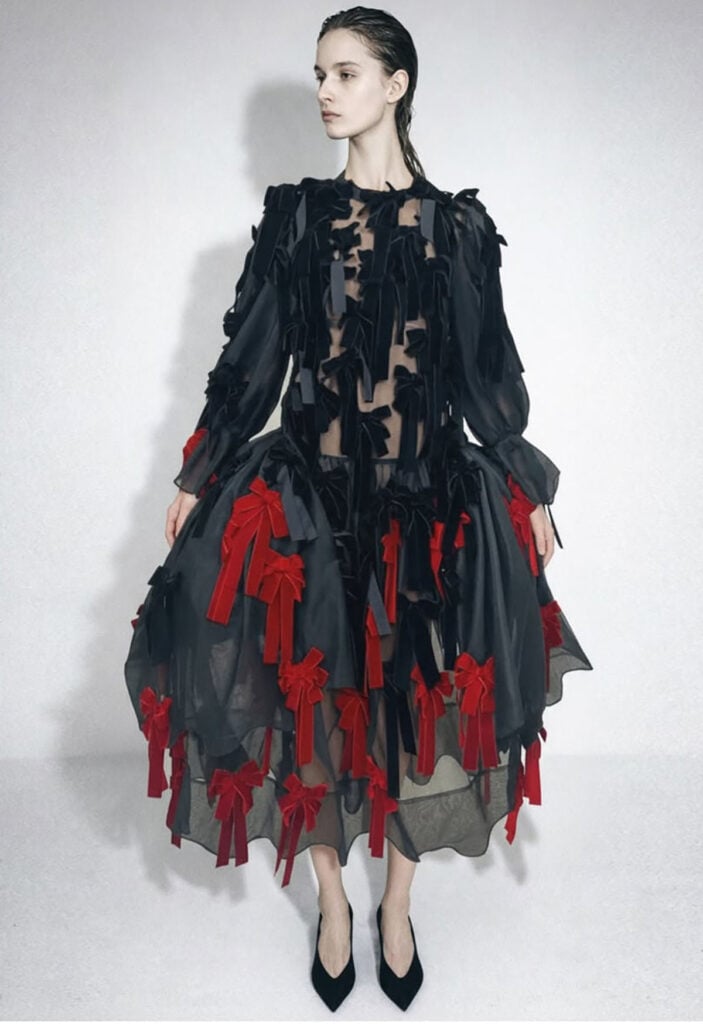 Considering the film’s mix of revenge thriller, Southern Gothic, and dark humour, this Abodi Fall 2026 look feels in step with that tone. The sheer black dress, layered with trailing ribbons and finished with clusters of red and black bows, is beautiful on paper – there’s a softness to the detailing that contrasts with the darker story it’s telling. But look closer, and there’s something slightly unsettling underneath it, which keeps it aligned with the film rather than just reading as decorative.
